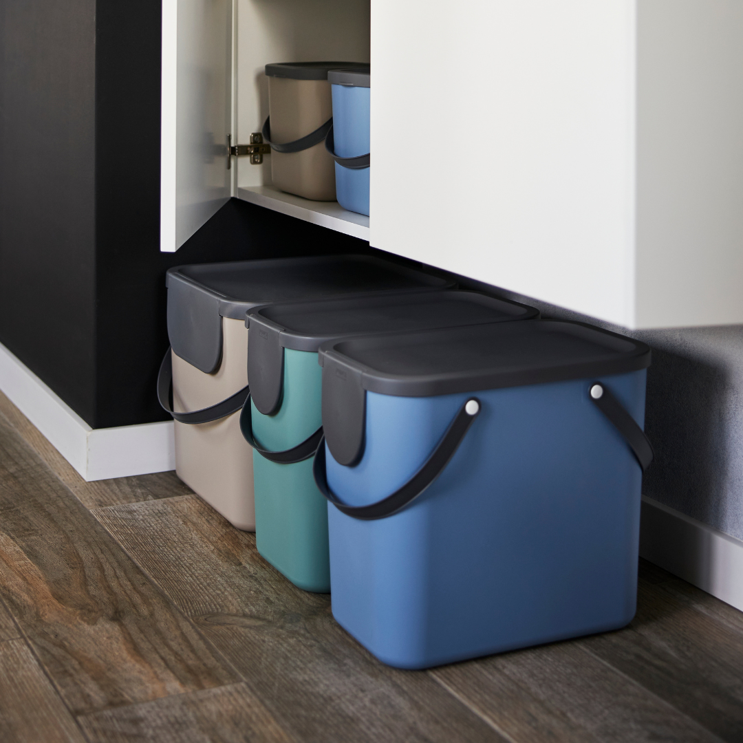 Finally a functional and design-oriented product for waste separation at home! Thanks to the slim shape and trendy colors, the recycling bins can be proudly displayed in your kitchen - where most waste is generated. The modularity and perfect stackability emphasize the well thought-out system.