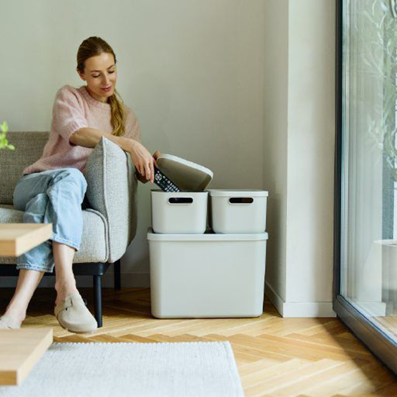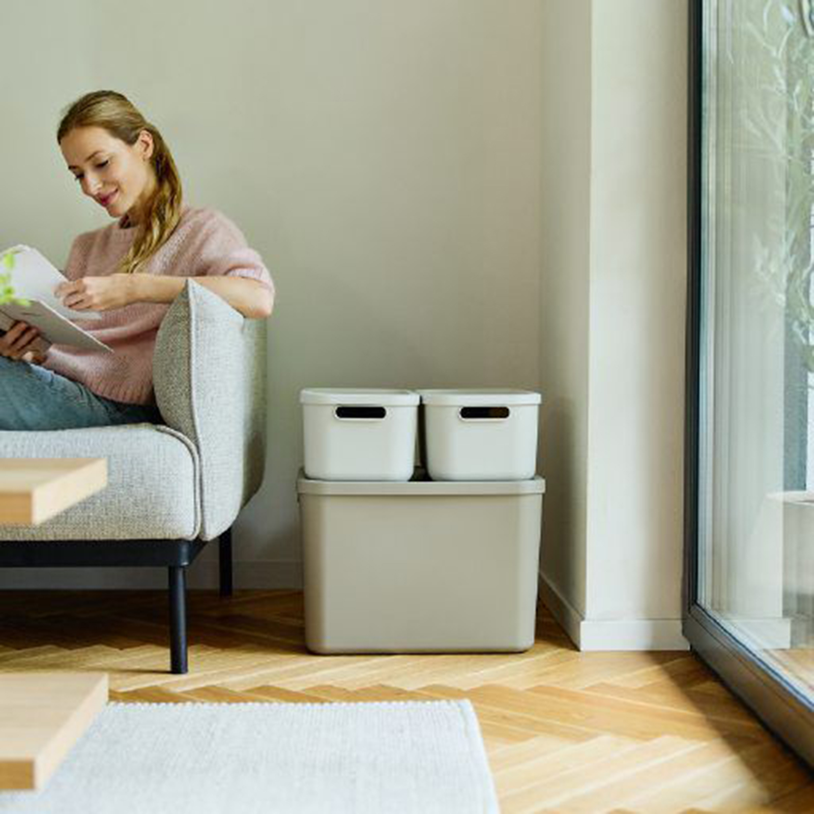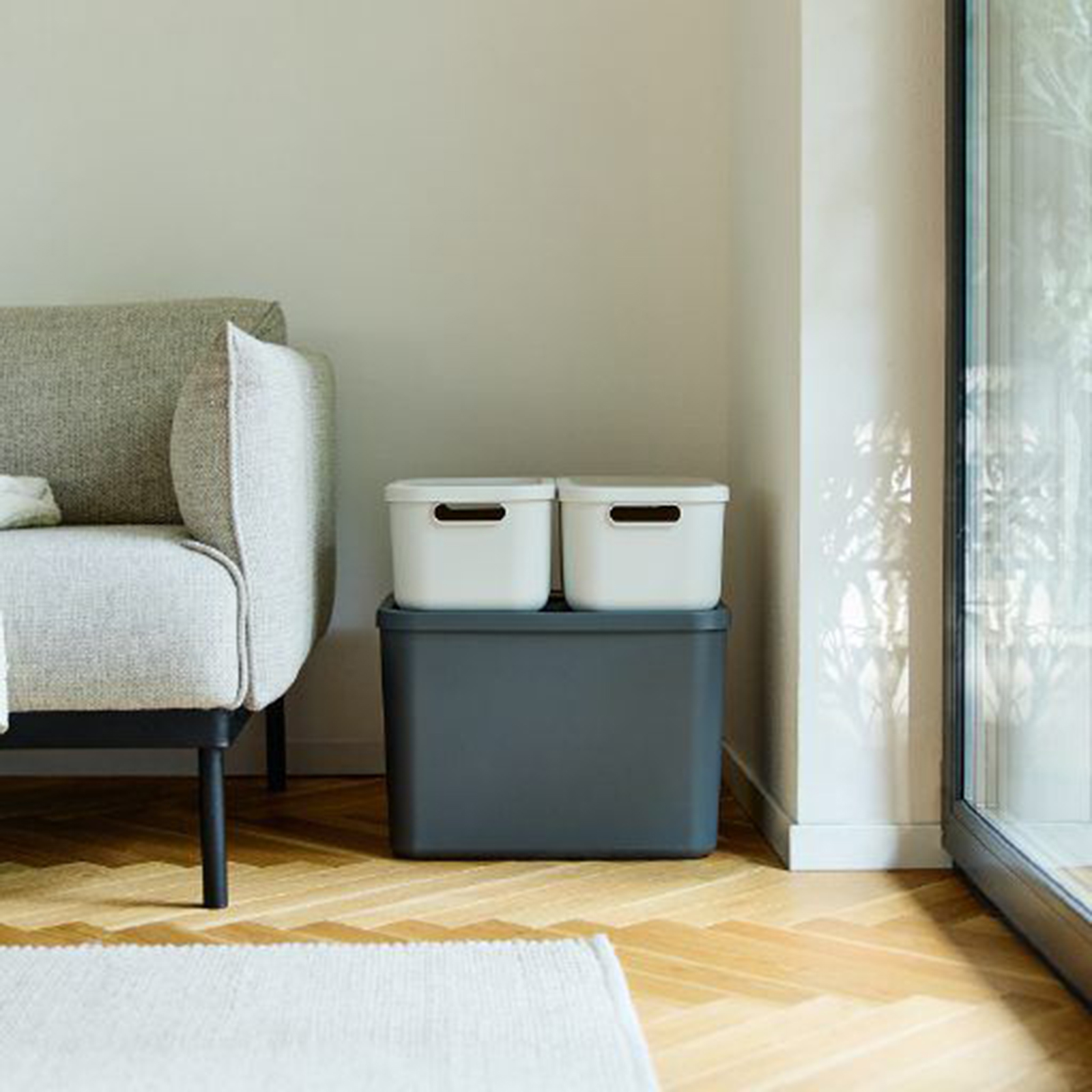 Grâce à son design moderne et à ses couleurs neutres, l’ensemble s’intègre harmonieusement dans tous les styles d’intérieur. Les boîtes sont empilables et équipées de poignées ouvertes et ergonomiques, pour un transport confortable même lorsqu’elles sont pleines.