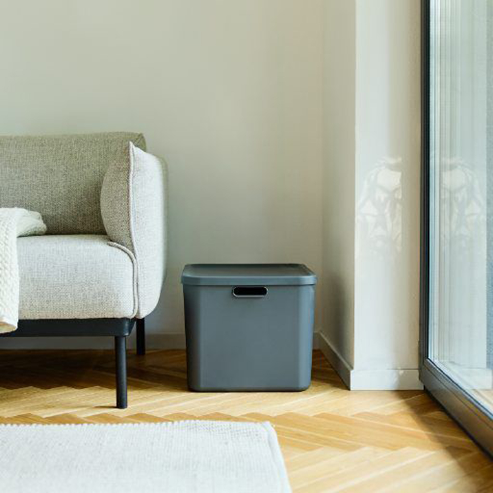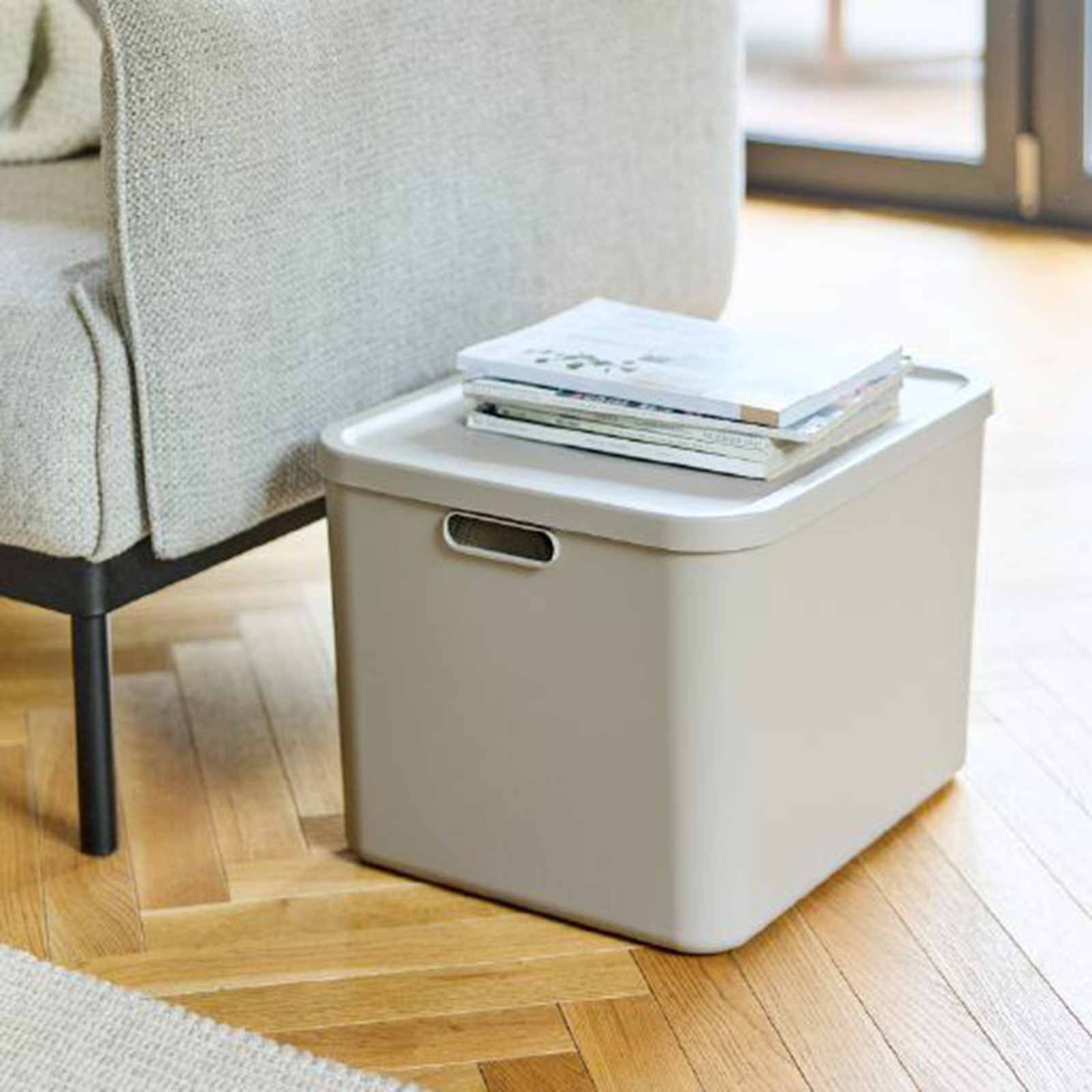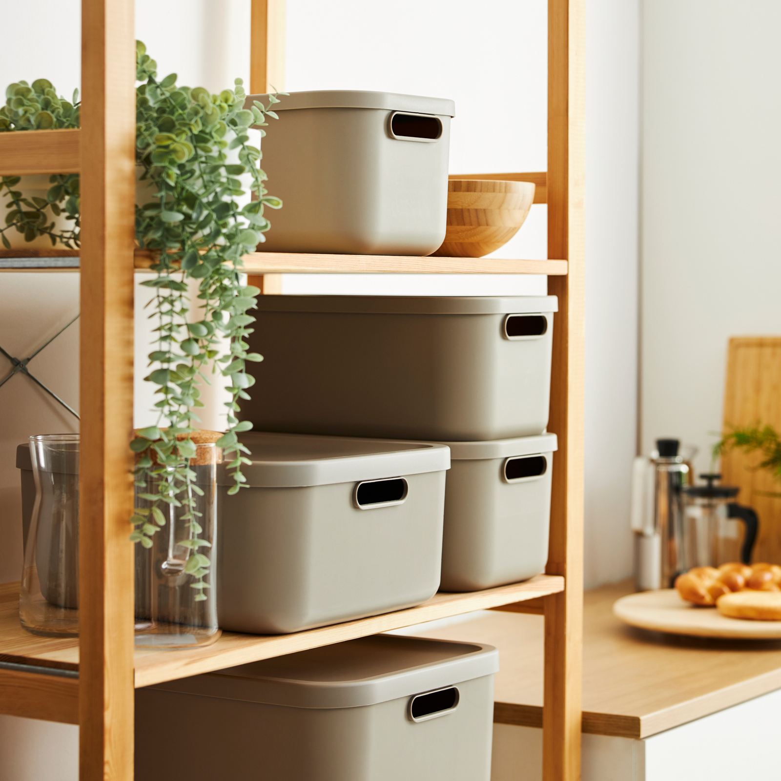 Grâce à son design moderne et à ses couleurs neutres, l’ensemble s’intègre harmonieusement dans tous les styles d’intérieur. Les boîtes sont empilables et équipées de poignées ouvertes et ergonomiques, pour un transport confortable même lorsqu’elles sont pleines.