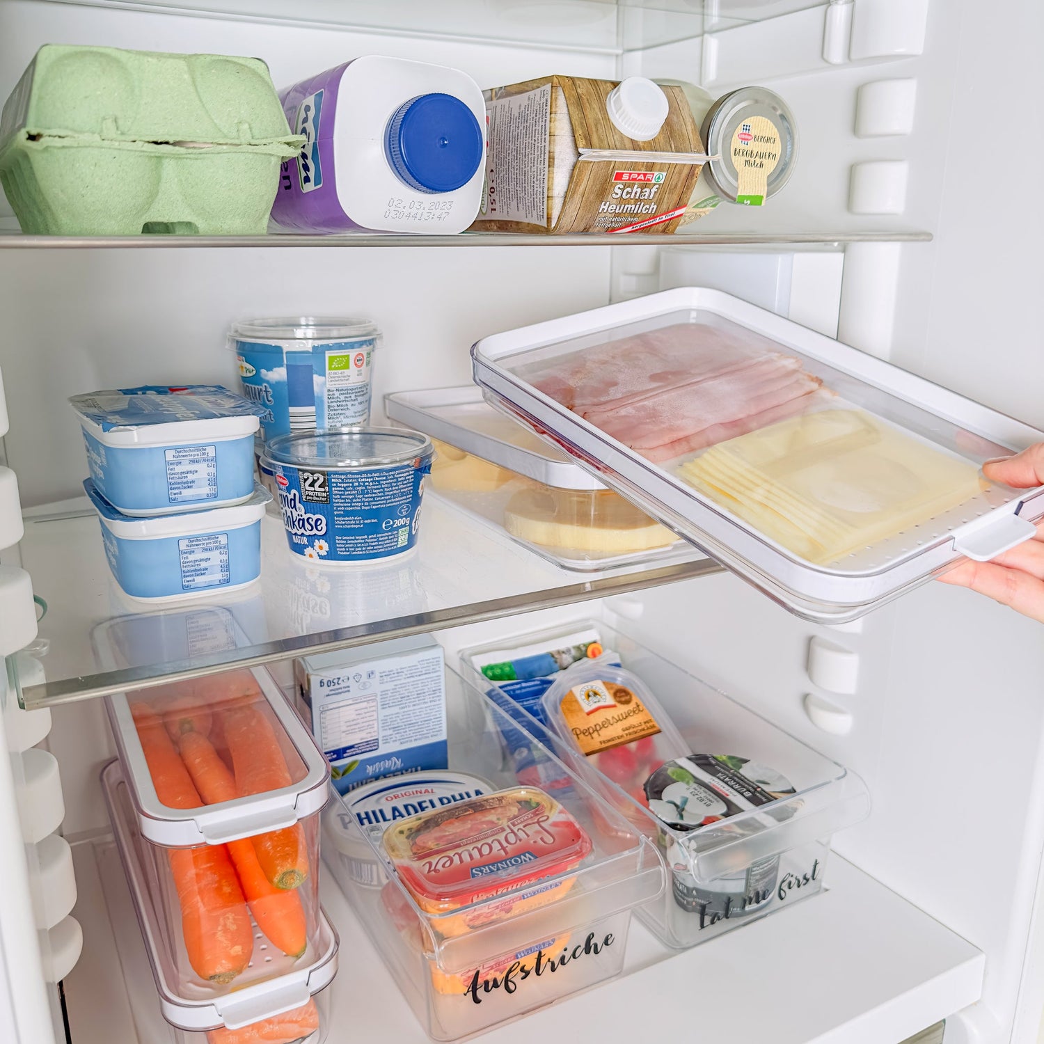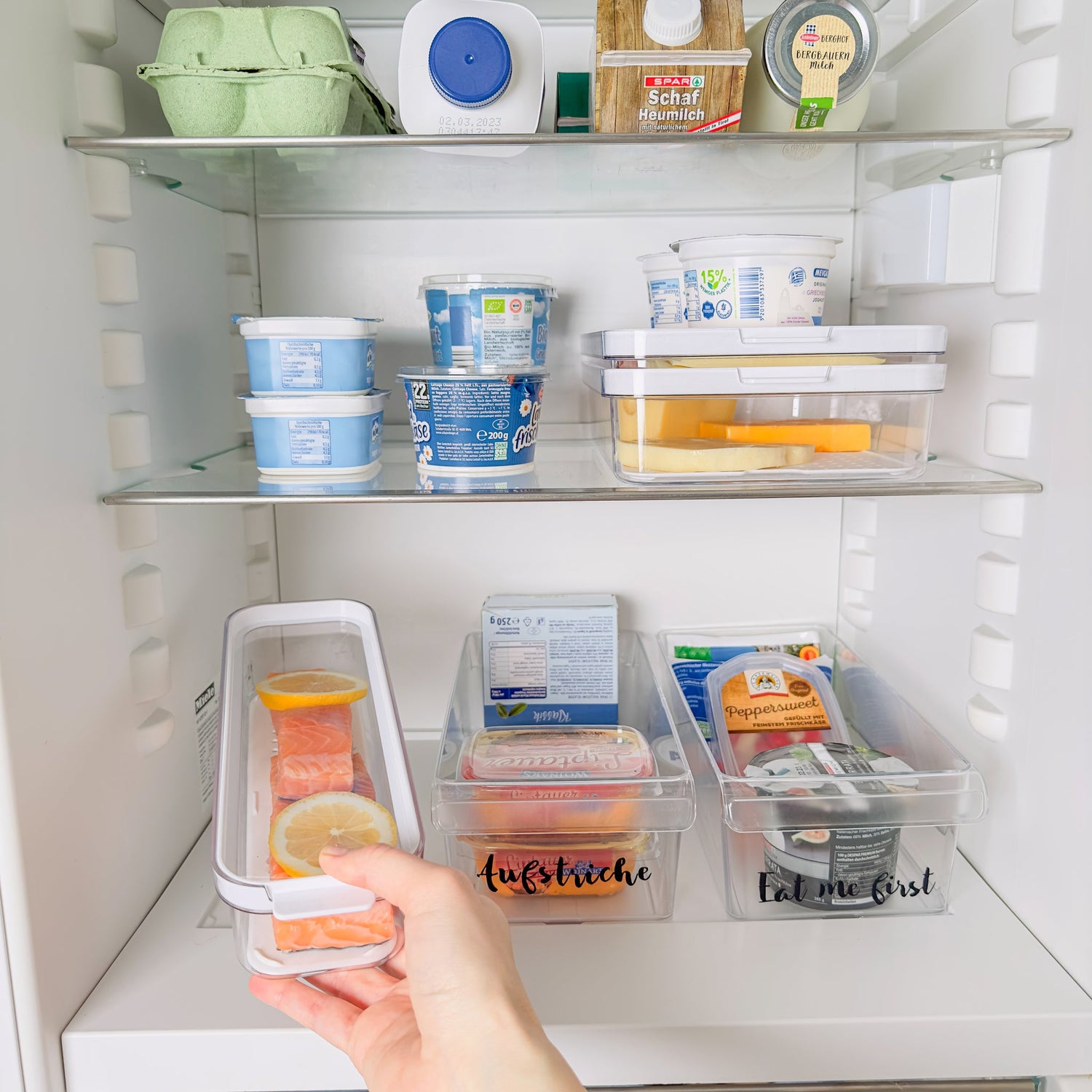 W zależności od nawyków żywieniowych można utworzyć strefy, takie jak strefa śniadaniowa lub strefa przekąsek, szczególnie dla dzieci. Używaj oddzielnych pojemników na ser, kiełbasę, produkty mleczne itp. Jeśli coś się rozleje, wystarczy wyczyścić tylko jedno pudełko. Pudełka pomagają również utrzymać porządek w strefach. Ułatwiają również dostęp do rzeczy znajdujących się z tyłu. Pojemniki można wysuwać jak szufladę lub umieszczać bezpośrednio na stole lub blacie roboczym. Dzięki znormalizowanym pojemnikom, które można układać jeden na drugim, można w pełni wykorzystać możliwości lodówki.