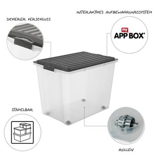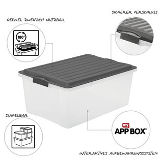 Die transparenten Kunststoffboxen sind mit beidseitig verwendbaren Deckeln ausgestattet und besitzen zwei stabile Schnappverschlüsse, die ein sicheres Verschließen und problemloses Stapeln ermöglichen. Bei Nichtgebrauch können die Boxen platzsparend ineinander gestapelt werden. Die komfortablen Tragegriffe erleichtern den Transport, sodass sich die Boxen ideal zur Aufbewahrung von Daunendecken, Campingausrüstung, Sportgeräten und vielem mehr eignen. Die enorm robuste Verarbeitung sorgt dafür, dass die Boxen auch bei intensiver Nutzung ihre Form behalten. Die 70-Liter-Boxen kommen mit schwarzen Deckeln und Verschlüssen, während die 38-Liter-Boxen mit anthrazitfarbenen Deckeln und Verschlüssen ausgestattet sind. Übersichtliche Aufbewahrung von voluminösen Gegenständen - optimal geeignet Daunendecken, Campingartikel, Sportausrüstung etc. - bei Nichtgebrauch platzsparendes Ineinanderstapeln möglich
