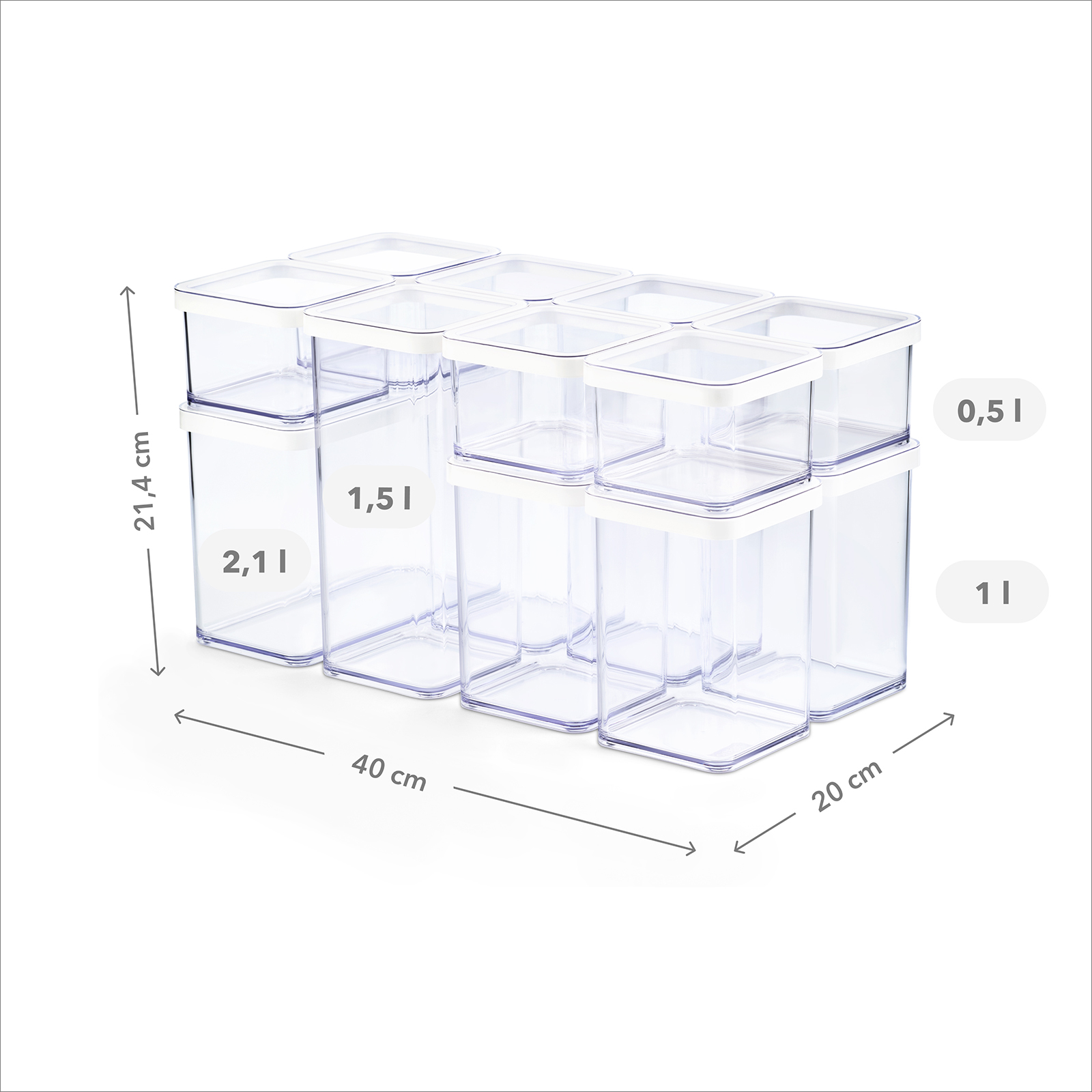 • Lieferumfang: 12-tlg. Aufbewahrungsboxen-Set inkl. 12x Deckel, 40×20×21,4 cm (L×B×H), Unterteil und Deckel transparent, Dichtungsring - 5x 0,5 l, 3x 1,0 l, 3x 1,5 l, 1x 2,1 l