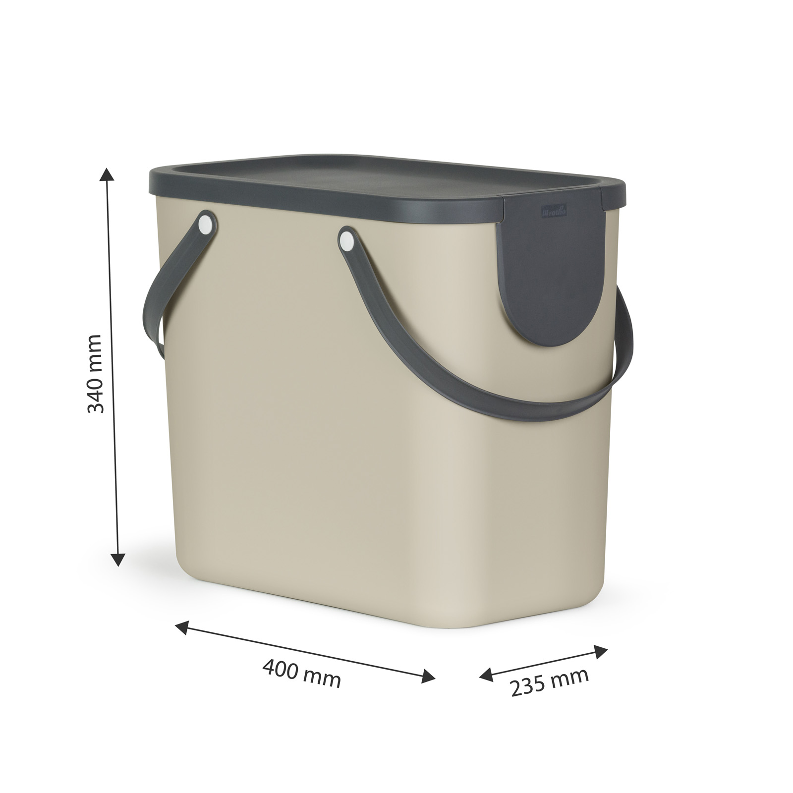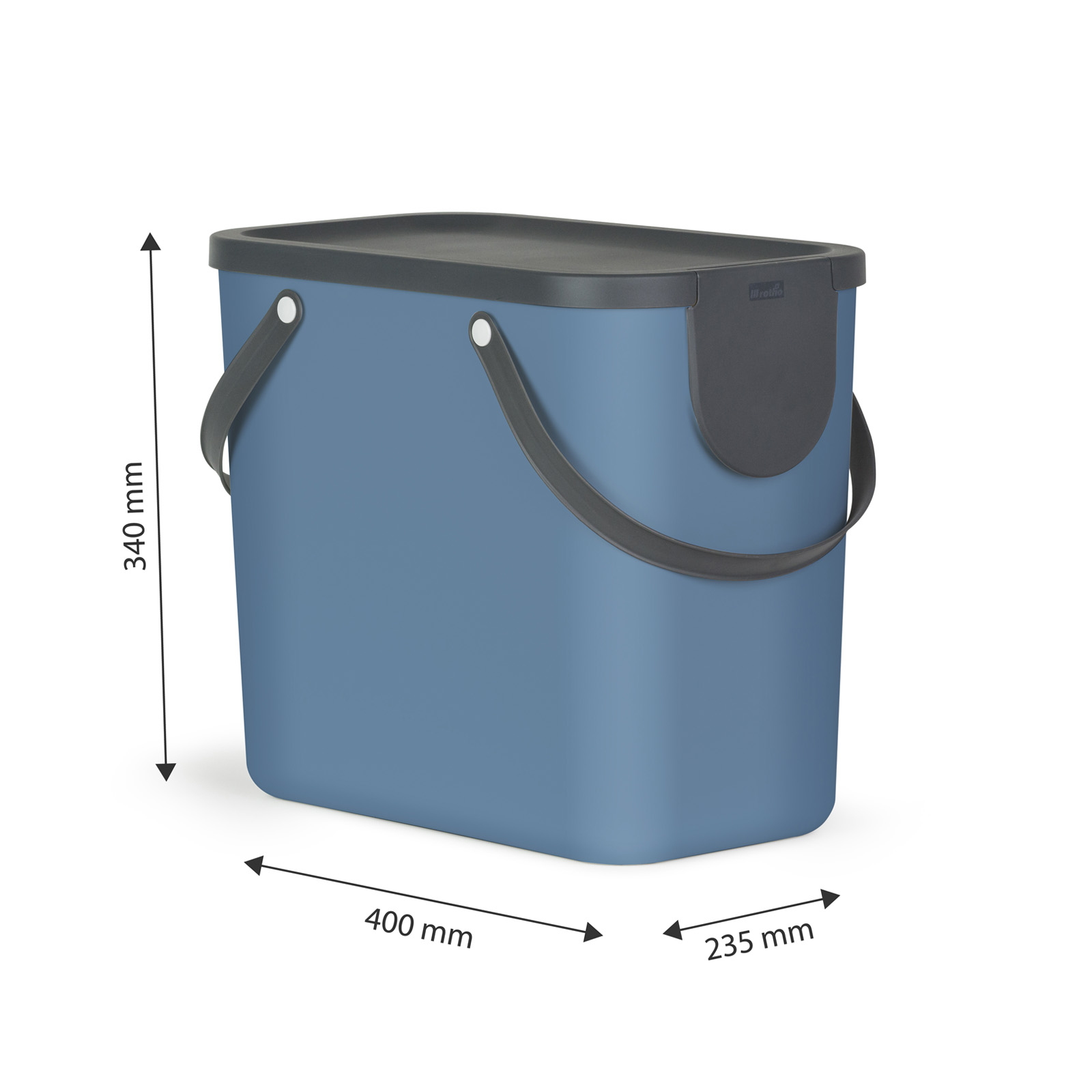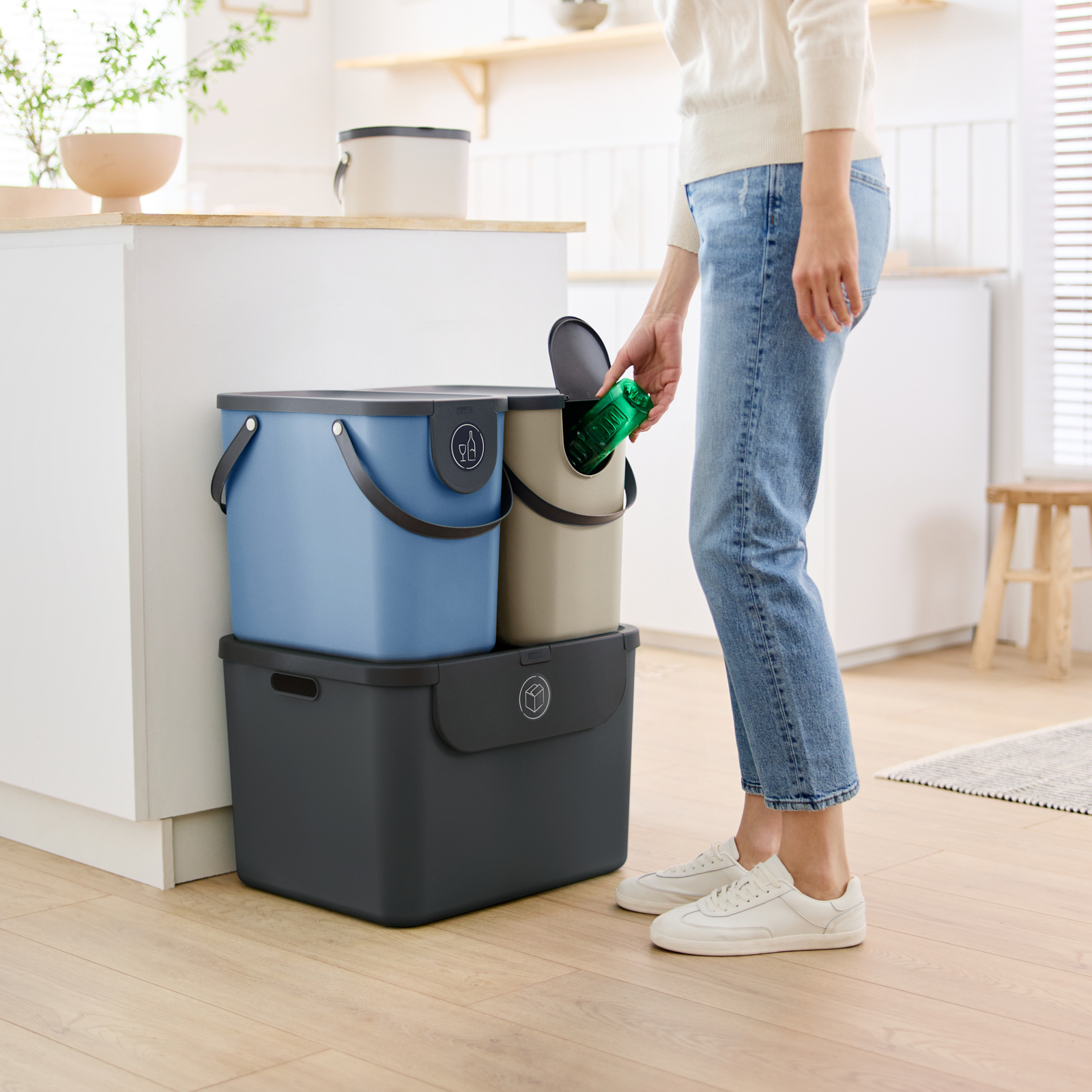 Das dreiteilige Set der Albula Recyclingbehälter bietet mit einem Behälter mit 55 Litern Volumen sowie zwei Behältern mit jeweils 25 Litern ausreichend Platz für die übersichtliche Trennung verschiedener Abfallarten. Der 55-Liter-Behälter ist mit einer schwenkbaren, extra breiten Klappe ausgestattet, die sich auch bei gestapelten Boxen mühelos öffnen lässt und sich ideal für die Entsorgung größerer Kartonagen eignet. Zwei seitliche Griffe erleichtern das Tragen, sei es zur Mülltonne oder zum Wertstoffhof. Dank des platzsparenden Designs fügt sich das Recyclingsystem harmonisch in Küche, Büro oder Hauswirtschaftsraum ein. Sechs vorgefertigte Sticker mit gut erkennbaren Symbolen unterstützen eine einfache und intuitive Mülltrennung. Die glatten Oberflächen sind besonders pflegeleicht und lassen sich schnell reinigen. Die Behälter können einzeln genutzt oder modular erweitert werden, wobei die beiden 25-Liter-Behälter beispielsweise perfekt auf den 55-Liter-Behälter passen. Ob Papier, PET, Glas oder Restmüll – mit dem Albula Recyclingsystem wird Mülltrennen einfach, effizient und alltagstauglich.