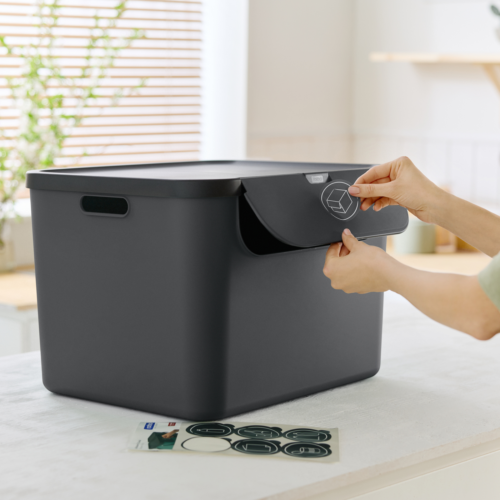 • Deckel auch gestapelt leicht zu öffnen, 2 lange Trageriemen für bequemes Tragen mit nur einer Hand, 6 Sticker zur klaren Abfalltrennung.