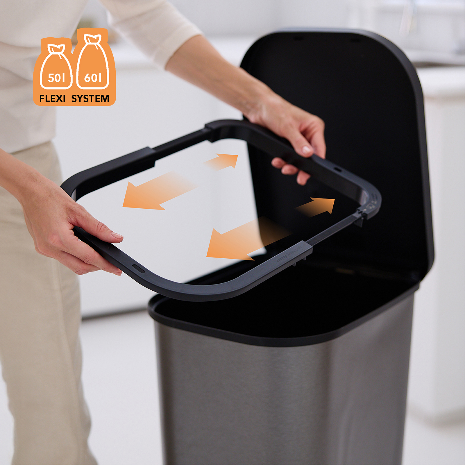 Der flexible Abfallbeutelhalter ist für Müllbeutel mit einem Volumen von 50 oder 60 Litern geeignet und kann auch mit dem Gelben Sack verwendet werden. Ein drehbarer Auslaufschutz-Einsatz verhindert unangenehme Verschmutzungen und ermöglicht eine saubere und hygienische Müllentsorgung. Damit ist der Rotho ORBE ein praktischer Recyclingmülleimer, der Komfort und Ordnung in den Alltag bringt.